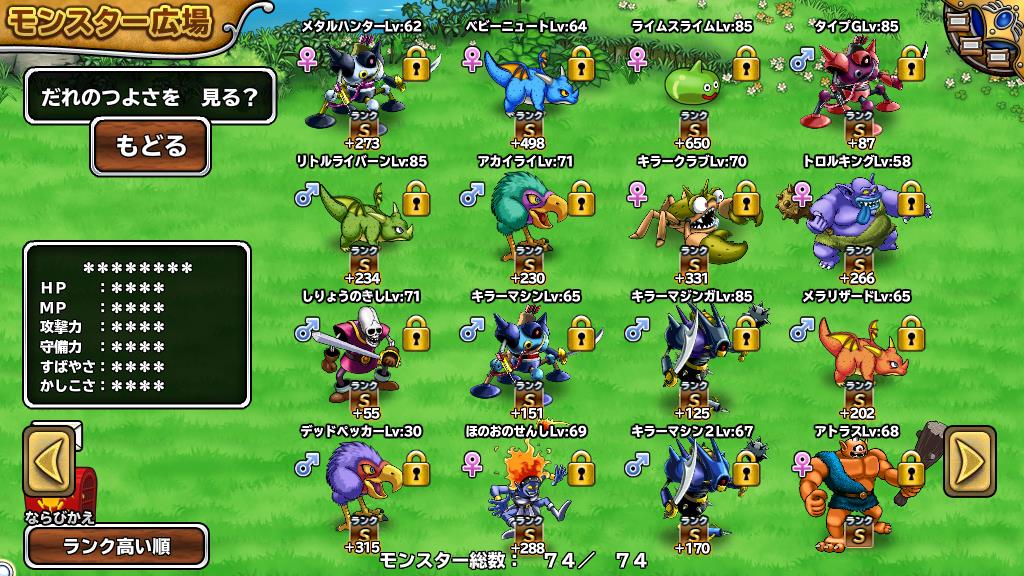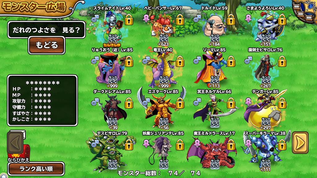 になった。ドラクエといえばⅠ・Ⅱのイメージが強くりゅうおうと竜王は+999まで終了、りゅうおうは会心(8.27)上げがまだで竜王はレベル・会心(6.97)上げがまだの状態で次の育成魔王をどうしようかと悩み中。。。Sランは全てで32体(