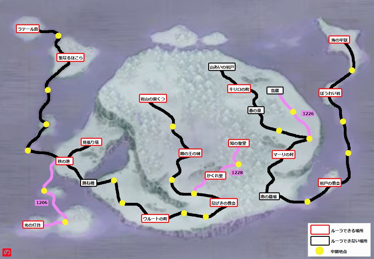 《緑の大陸》 《荒れ地の大陸》 《中央の大陸》 《炎の大陸》 《炎の大陸 近海》 《海神の領海》 《海の底》 《夜の大陸》 《いにしえの魂の座》 《闇はらむ雲海》 ストーリーチャート※【 】・・・ルーラ可能 【ラテール島】→中間→【聖なるほこら】 【聖なるほこら】→中間→中間→中間→【秋の港】 【秋の港】→跳ね橋 ルーラで【秋の港】へ戻る。 【秋の港】→【見張り塔】 見張り塔■見張り塔 物見の門→中間地点→中間地点→中間地点→中間地点→2階への階段(上に行く) 『1階への階段』→中間地点→中間地点→中間地点→橋げた操作所 見張り塔クリア後ルーラで【秋の港】へ戻る。 【秋の港】→跳ね橋→中間→中間→【ウルートの町】 【ウルートの町】→中間→中間→【なげきの教会】→中間→中間→【闇の王の城】 【闇の王の城】→中間→【岩山の洞くつ】 岩山の洞くつ■岩山の洞くつ 岩壁のほら穴→中間地点→中間地点→地下2層への階段(下に行く) 『地下1層への階段』→中間地点→中間地点→中間地点→ぬかるむ岩洞→中間地点→地下1層への階段(上に行く) 『地下2層への階段』→中間地点→中間地点→山あいの岩戸(外に出る) 岩山の洞くつクリア後山あいの岩戸→【キリロの町】 【キリロの町】→春の泉→中間→中間→【マーリの村】→南の墓場 南の墓場→中間→【岩戸の教会】→中間→中間→【ぼうれい岩】→中間→【海の牢獄】 海の牢獄■海の牢獄 獄門→中間地点→中間地点→中間地点→中間地点→中間地点→中間地点→地下1階への階段(下に行く) 『1階への階段』→中間地点→中間地点→中間地点→中間地点→地下2階への階段(下に行く) 地下2階で最初に行くべき場所は懲罰房00号。 懲罰房00号→中間地点→地下3階への階段(下に行く) 地下2階の攻略(地下1階への階段→ボス戦→地下3階への階段まで)にはスタミナ7必要。 『地下2階への階段』→中間地点→中間地点→中間地点→中間地点→中間地点→中間地点→『転送の間』 闇の王の城■闇の王の城 1~2階にはいたるところにモンスター(ライノソルジャー)がいるが、ここは通行不可。行こうとすると仲間に止められる。マップが非常に広く複雑だが、モンスターを「壁」と見て分岐では常にモンスターがいない方を選ぶことでほぼ一本道になる。途中で1回だけ宝箱分岐ルートあり。 転送の間→中間地点→中間地点→中間地点→中間地点→2階への階段(上に行く)→中間地点→1階への階段(下に行く) 『2階への階段』→中間地点→中間地点→中間地点→2階への階段(上に行く) 『1階への階段』→中間地点→1階への階段(階段を降りると宝箱ルート。但し宝箱の先は行き止まりなので注意(スタミナを節約したい場合は宝箱を取った後リレミトポイントまで戻ること))→中間地点→中間地点→中間地点→中間地点→『沈黙の回廊』→中間地点→1階への階段(下に行く)→中間地点→中間地点→『大広間』→中間地点→中間地点→2階への階段(西側)(上に行く)→中間地点→中間地点→中間地点→中間地点→3階への大階段(上に行く) 『2階への大階段』→中間地点→中間地点→中間地点→中間地点→中間地点→中間地点→玉座の間 闇の王の影戦(6回目)後ルーラで【闇の王の城】に行く。 闇の王の城(2回目)■闇の王の城 『2階への大階段』→中間地点→中間地点→中間地点→中間地点→中間地点→中間地点→玉座の間 マップ施設