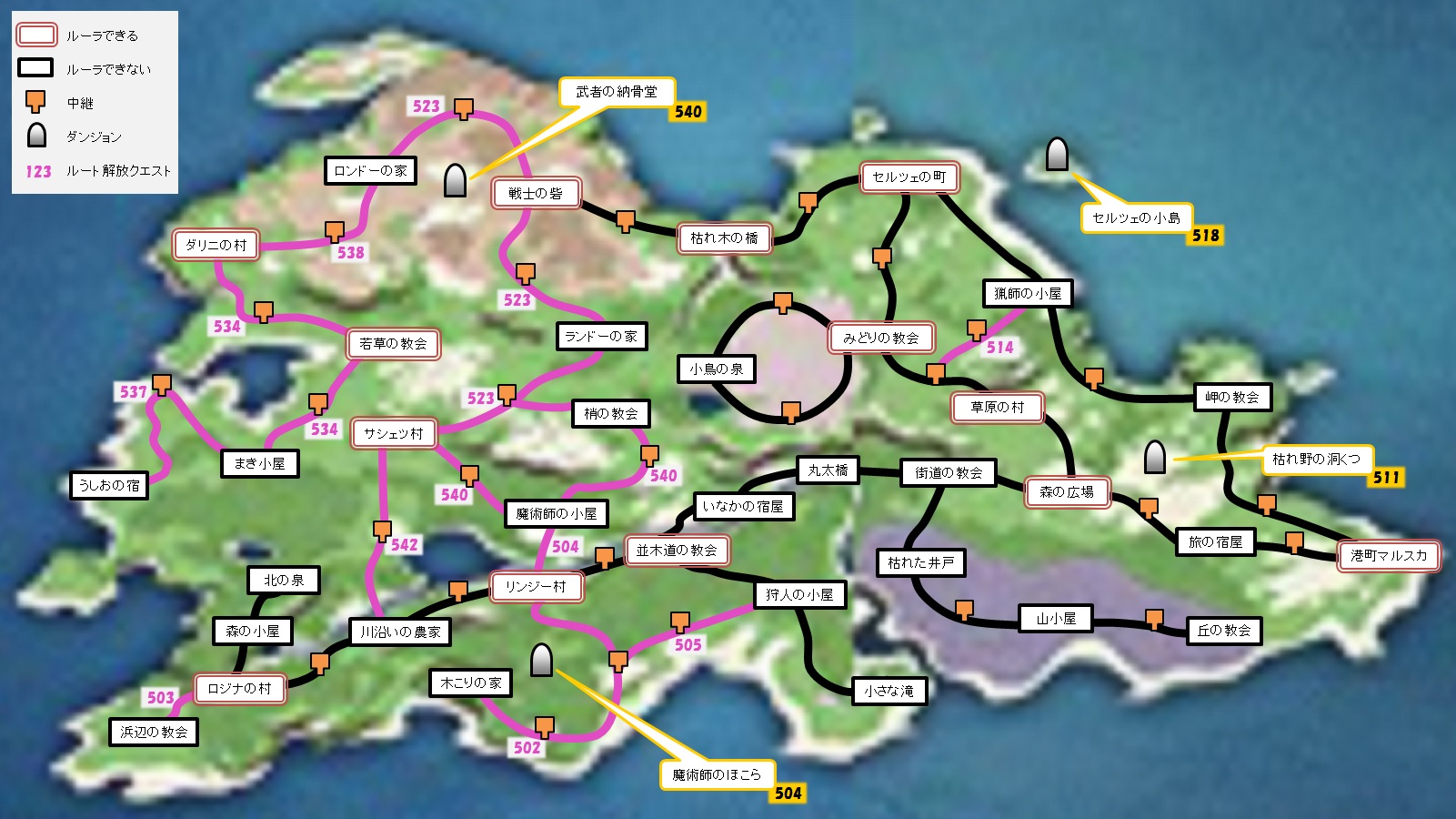 ※【】ルーラ可能 プロローグ 【ロジナの村】→森の小屋→北の泉 オープニングが流れ、以降オートセーブ 【ロジナの村】→中継→川沿いの農家→中継→【リンジー村】→中継→【並木道の教会】 滝ルート出現 【並木道の教会】→狩り人の小屋→小さな滝 【並木道の教会】→いなかの宿屋→丸太橋→街道の教会→【森の広場】 東ルート 【森の広場】→中継→旅の宿屋→中継→【港町マルスカ】 【森の広場】→【草原の村】→中継→【みどりの教会】 花畑周回ルート出現 【みどりの教会】→中継→小鳥の泉→中継→【みどりの教会】 【みどりの教会】→中継→【セルツェの町】 【セルツェの町】→中継→【枯れ木の橋】→中継→【戦士の砦】 中継にて、力試しのために新規ルート出現 キャラバンマスターの証を取得後、【セルツェの町】から新規ルート出現 施設
