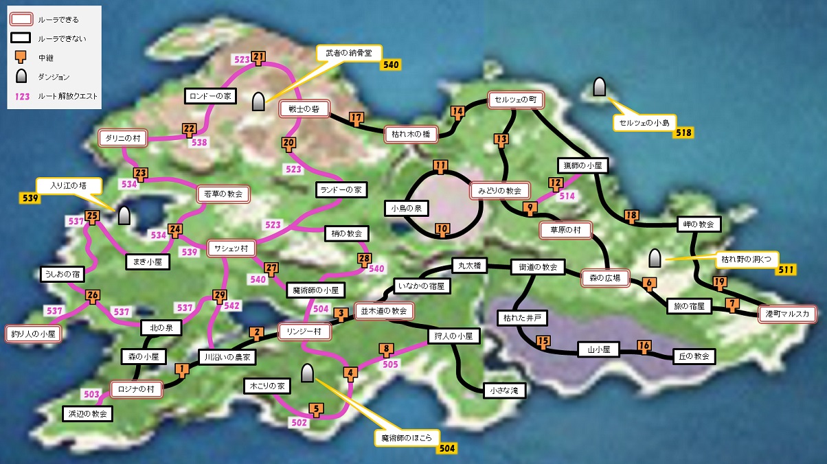※【】ルーラ可能 プロローグ 【ロジナの村】→森の小屋→北の泉 オープニングが流れ、以降オートセーブ 【ロジナの村】→中継→川沿いの農家→中継→【リンジー村】→中継→【並木道の教会】 滝ルート出現 【並木道の教会】→狩り人の小屋→小さな滝 【並木道の教会】→いなかの宿屋→丸太橋→街道の教会→【森の広場】 東ルート 【森の広場】→中継→旅の宿屋→中継→【港町マルスカ】 【森の広場】→【草原の村】→中継→【みどりの教会】 花畑周回ルート出現 【みどりの教会】→中継→小鳥の泉→中継→【みどりの教会】 【みどりの教会】→中継→【セルツェの町】 【セルツェの町】→中継→【枯れ木の橋】→中継→【戦士の砦】 中継にて、力試しのために新規ルート出現 キャラバンマスターの証を取得後、【セルツェの町】から新規ルート出現 施設