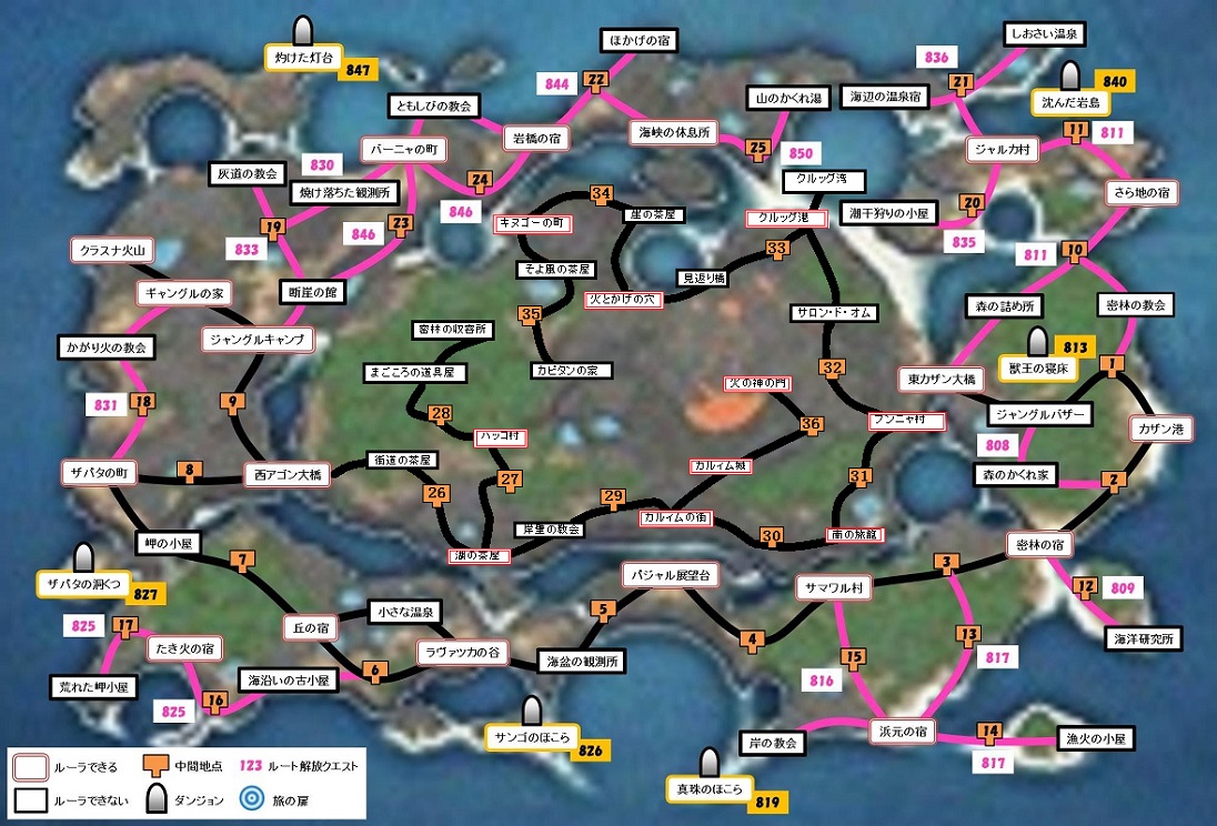 《緑の大陸》 《荒れ地の大陸》 《中央の大陸》 《炎の大陸 近海》 《海神の領海》 《光の大陸》 炎の大陸序盤※【 】・・・ルーラ可能 【カザン港】→中間→ジャングルバザー→【東カザン大橋】 【カザン港】→中間→【密林の宿】→中間→【サマワル村】 【サマワル村】→中間→【パジャル展望台】→中間→海盆の観測所→【ラヴァツカの谷】 【ラヴァツカの谷】→中間orちいさな温泉→【丘の宿】→中間→岬の小屋→【ザパタの町】 【ザパタの町】→中間→【西アゴン大橋】 【西アゴン大橋】→中間→【ジャングルキャンプ】→【ギャングルの家】→【クラスナ火山】 クラスナ火山ここでの目的は、敵のドロップアイテム収集にある。 キースドラゴンが落とす灼熱のルビー10個 雑魚のフレイム、キースドラゴンは地下1~4階に出現、加えて強敵モンスター(Lv60)として固定で出現する場所が6ヶ所存在する。 クラスナ火山内部■クラスナ火山内部