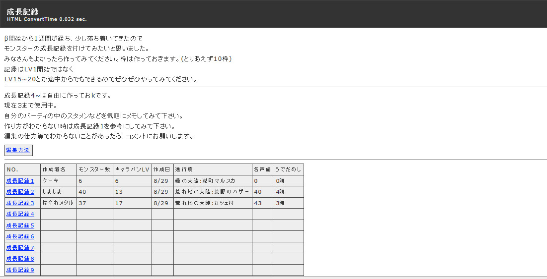 NO.作成者モンスター数キャラバンLV作成日進行度名声値うでだめし