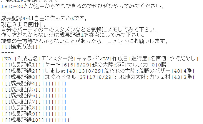 |成長記録10|プリン|30|12|8/29|荒地の大陸:荒れ地のバザー|20|1勝 |と入力すると