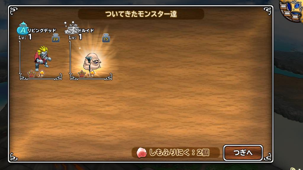 その後落ちていきました。海神、30パレで福引12枚ということに。でも銀が2つ落ちてくれてます。銀=銅2とすると30パレで14枚換算でほぼ50%。無肉スカウト成功2つきました!スライムベスとホイミスライム。軽いのだけが取り柄なのかなあ。色としてはピーチほしかったけど