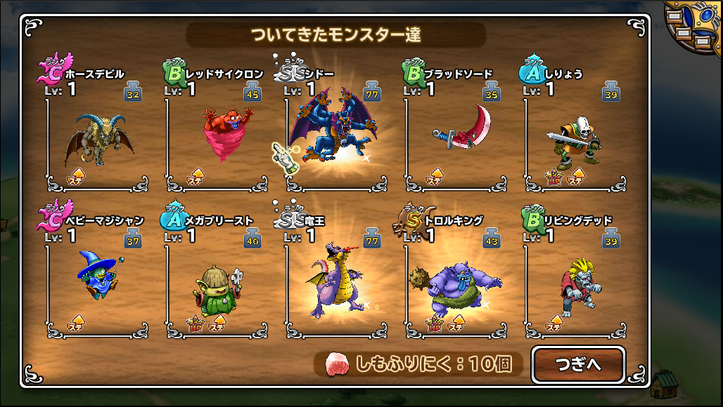 イベント肉30と手持ちの肉56投げてシドー、ドレアム、オロチ、レオ来たw --
