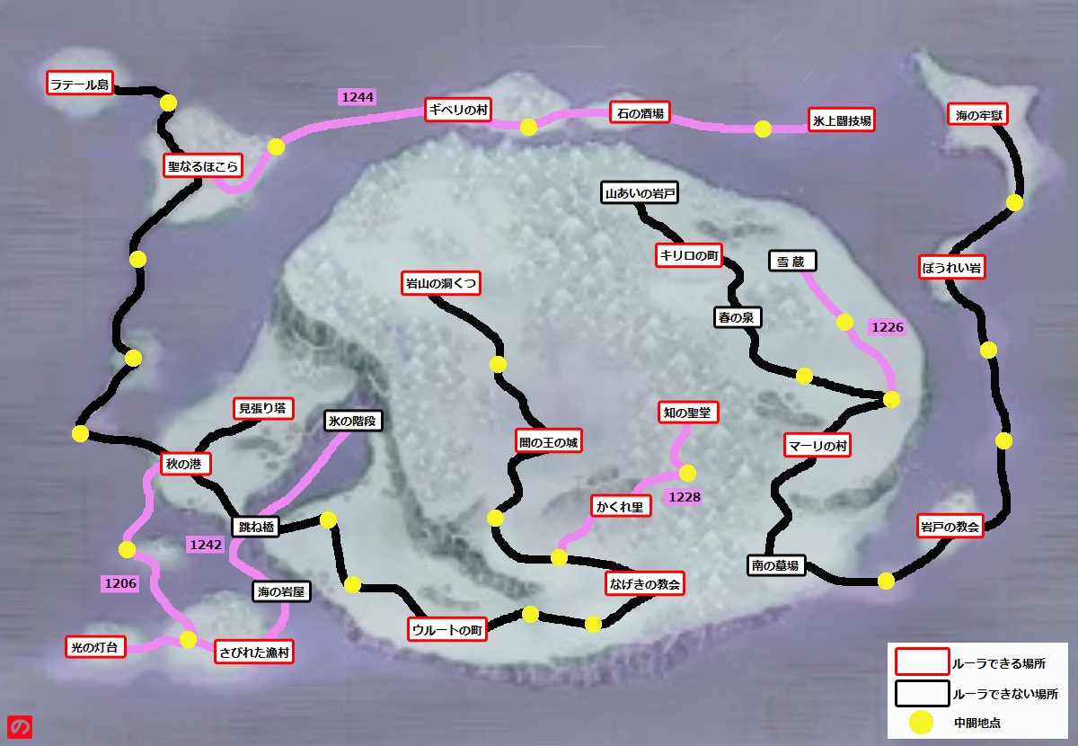 《緑の大陸》 《荒れ地の大陸》 《中央の大陸》 《炎の大陸》 《炎の大陸 近海》 《海神の領海》 《海の底》 《夜の大陸》 《光の大陸》 《いにしえの魂の座》 《闇はらむ雲海》 《石の世界》 《炎の世界》 ストーリーチャート※【 】・・・ルーラ可能 【ラテール島】→中間→【聖なるほこら】 【聖なるほこら】→中間→中間→中間→【秋の港】 【秋の港】→跳ね橋 ルーラで【秋の港】へ戻る。 【秋の港】→【見張り塔】 見張り塔■見張り塔 物見の門→中間地点→中間地点→中間地点→中間地点→2階への階段(上に行く) 『1階への階段』→中間地点→中間地点→中間地点→橋げた操作所 見張り塔クリア後ルーラで【秋の港】へ戻る。 【秋の港】→跳ね橋→中間→中間→【ウルートの町】 【ウルートの町】→中間→中間→【なげきの教会】→中間→中間→【闇の王の城】 【闇の王の城】→中間→【岩山の洞くつ】 岩山の洞くつ■岩山の洞くつ 岩壁のほら穴→中間地点→中間地点→地下2層への階段(下に行く) 『地下1層への階段』→中間地点→中間地点→中間地点→ぬかるむ岩洞→中間地点→地下1層への階段(上に行く) 『地下2層への階段』→中間地点→中間地点→山あいの岩戸(外に出る) 岩山の洞くつクリア後山あいの岩戸→【キリロの町】 【キリロの町】→春の泉→中間→中間→【マーリの村】→南の墓場 南の墓場→中間→【岩戸の教会】→中間→中間→【ぼうれい岩】→中間→【海の牢獄】 海の牢獄■海の牢獄 獄門→中間地点→中間地点→中間地点→中間地点→中間地点→中間地点→地下1階への階段(下に行く) 『1階への階段』→中間地点→中間地点→中間地点→中間地点→地下2階への階段(下に行く) 地下2階で最初に行くべき場所は懲罰房00号。 懲罰房00号→中間地点→地下3階への階段(下に行く) 地下2階の攻略(地下1階への階段→ボス戦→地下3階への階段まで)にはスタミナ7必要。 『地下2階への階段』→中間地点→中間地点→中間地点→中間地点→中間地点→中間地点→『転送の間』 闇の王の城■闇の王の城 1~2階にはいたるところにモンスター(ライノソルジャー)がいるが、ここは通行不可。行こうとすると仲間に止められる。マップが非常に広く複雑だが、モンスターを「壁」と見て分岐では常にモンスターがいない方を選ぶことでほぼ一本道になる。途中で1回だけ宝箱分岐ルートあり。 転送の間→中間地点→中間地点→中間地点→中間地点→2階への階段(上に行く)→中間地点→1階への階段(下に行く) 『2階への階段』→中間地点→中間地点→中間地点→2階への階段(上に行く) 『1階への階段』→中間地点→1階への階段(階段を降りると宝箱ルート。但し宝箱の先は行き止まりなので注意(スタミナを節約したい場合は宝箱を取った後リレミトポイントまで戻ること))→中間地点→中間地点→中間地点→中間地点→『沈黙の回廊』→中間地点→1階への階段(下に行く)→中間地点→中間地点→『大広間』→中間地点→中間地点→2階への階段(西側)(上に行く)→中間地点→中間地点→中間地点→中間地点→3階への大階段(上に行く) 『2階への大階段』→中間地点→中間地点→中間地点→中間地点→中間地点→中間地点→玉座の間 闇の王の影戦(6回目)後ルーラで【闇の王の城】に行く。 闇の王の城(2回目)■闇の王の城 『2階への大階段』→中間地点→中間地点→中間地点→中間地点→中間地点→中間地点→玉座の間 マップ施設