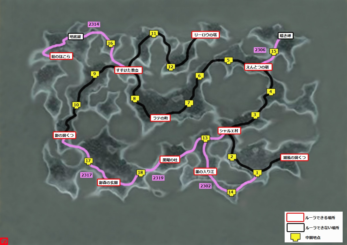 《緑の大陸》 《荒れ地の大陸》 《中央の大陸》 《炎の大陸》 《炎の大陸 近海》 《海神の領海》 《海の底》 《夜の大陸》 《光の大陸》 《いにしえの魂の座》 《闇はらむ雲海》 《石の世界》 《炎の世界》 《ミノロ島》 《魔獣の空域》 《魔獣の世界》 《地下世界》 《空中庭園》 《守見の異空》 《海の異空》 《ミノロ島の異空》 《荒れ地の異空》 ストーリーチャート※【 】・・・ルーラ可能! 【潮風の洞くつ】→中間→中間→【シャルエ村】 【シャルエ村】→中間→中間→【えんとつの宿】→中間→中間→中間→【ラテの町】 【ラテの町】→中間→【すすけた教会】→中間→中間→【影の洞くつ】 影の洞くつ■影の洞くつ 入口→中間地点→中間地点→中間地点→中間地点→影の門 影の門到着後、会話イベントが続く。 影の洞くつクリア後ルーラで【すすけた教会】に行く。 【ラテの町】に行くと会話イベントあり。 【すすけた教会】→中間→中間→【リーロウの塔】 リーロウの塔■リーロウの塔 1階から2階に上がる階段が左右に2つあるが、3階で合流できるのでどちらからでも進める。2階で必要なスタミナも同じ「5」。ただし2階で取れる宝箱が左右で変わる。以下は右ルート。 『1階への階段』→中間地点→中間地点→中間地点→中間地点→3階への階段(上に行く) 3階から4階に上がる階段が左下と右上の2つある。4階でゴールまで必要なスタミナはどちらでも同じ。 『3階への階段』→中間地点→中間地点→中間地点→中間地点→リーロウの聖壇 戦闘後イベントがあり、自動的に緑の大陸へ。 栄光の塔クリア後ルーラで【影の洞くつ】へ。 影の洞くつ (2回目)■影の洞くつ 入口→中間地点→中間地点→中間地点→中間地点→影の間 マップ施設