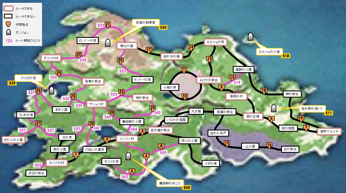 ※【】ルーラ可能 プロローグ 【ロジナの村】→森の小屋→北の泉 オープニングが流れ、以降オートセーブ 【ロジナの村】→中継→川沿いの農家→中継→【リンジー村】→中継→【並木道の教会】 滝ルート出現 【並木道の教会】→狩り人の小屋→小さな滝 【並木道の教会】→いなかの宿屋→丸太橋→街道の教会→【森の広場】 東ルート 【森の広場】→中継→旅の宿屋→中継→【港町マルスカ】 【森の広場】→【草原の村】→中継→【みどりの教会】 花畑周回ルート出現 【みどりの教会】→中継→小鳥の泉→中継→【みどりの教会】 【みどりの教会】→中継→【セルツェの町】 【セルツェの町】→中継→【枯れ木の橋】→中継→【戦士の砦】 中継にて、力試しのために新規ルート出現 キャラバンマスターの証を取得後、【セルツェの町】から新規ルート出現 施設