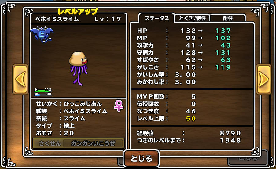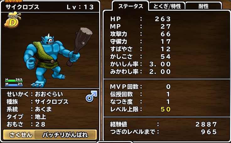 性格は全部で45種類 このページは初期値ではなく伸び率です。 スカウトで同じ種類のモンスターが2匹来た時にどちらがいいんだろう? HPの成長率順に上からまとまっており、、 HP/HP=リリパットLV15/ももんじゃLV15/上級モンスターLV15のHPを表す。 HPアップ:特大【HP補正+60】HP90/HP130/HP260 【HP補正+45】HP75/HP110/HP230 【HP補正+40】HP70/HP105/HP220 【HP補正+35】HP65/HP95/HP210 【HP補正+30】HP60/HP85/HP200 HPアップ:大【HP補正+25】HP55/HP80/HP175 【HP補正+20】HP50/HP75/HP150 【HP補正+15】HP45/HP70/HP140 HPアップ:中【HP補正+10】HP40/HP65/HP130 【HP補正+5】HP35/HP60/HP120 【HP補正+0】HP30/HP55/HP110 メモまだ記載してない性格などについて おおぐらい・・・HP高い くろうにん・・・HPと守備力高い ご指摘があったのでその回答 ①性別が違っても初期値は同じです。2chでも話題になり、全く同じだと報告ありました。 例えば実際の例で言うと、 ランクという基準ではなく、 この表で上に載ってる性格を育てるほど高くなり コメント |