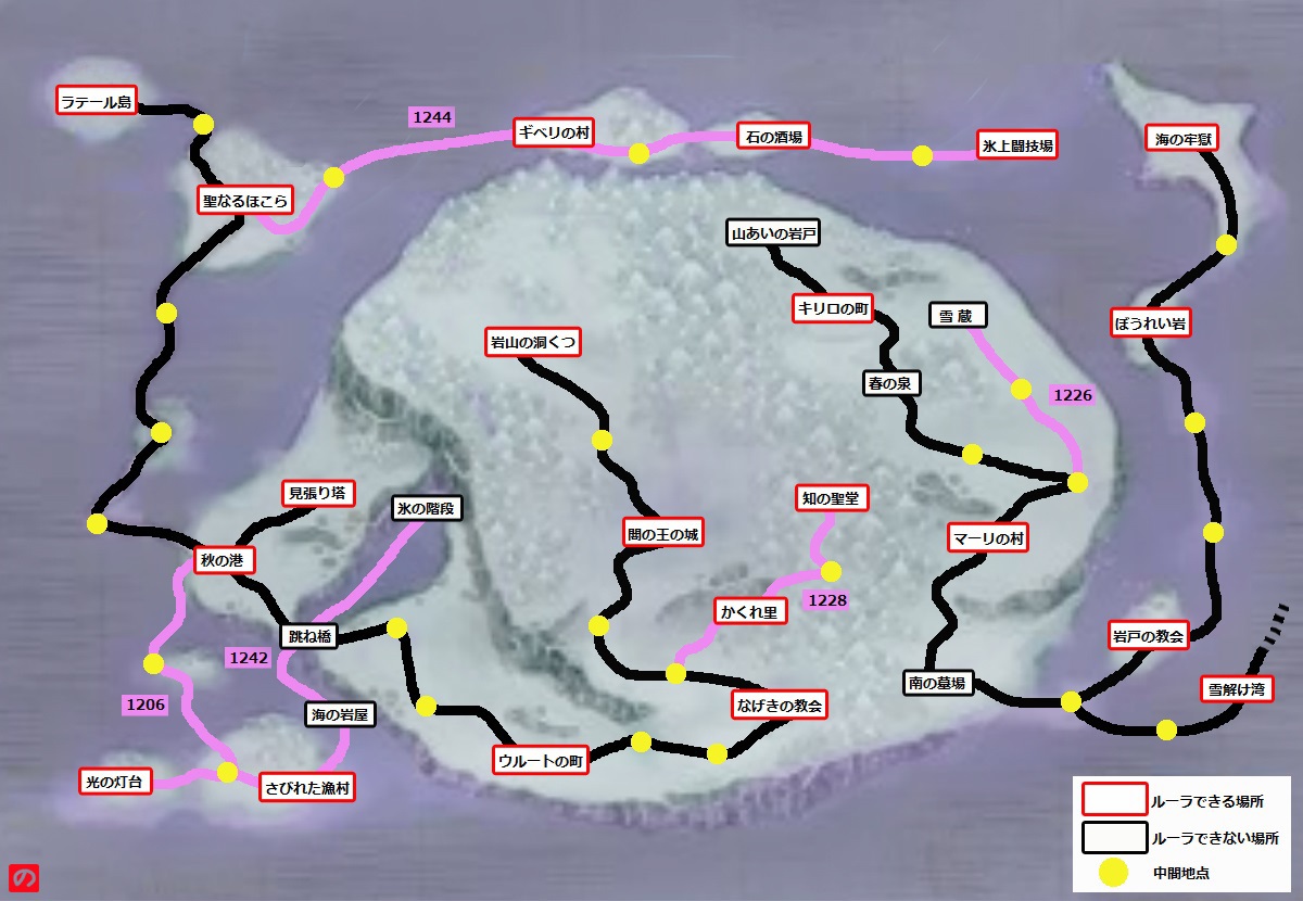 《緑の大陸》 《荒れ地の大陸》 《中央の大陸》 《炎の大陸》 《炎の大陸 近海》 《海神の領海》 《海の底》 《夜の大陸》 《光の大陸》 《いにしえの魂の座》 《闇はらむ雲海》 《石の世界》 《炎の世界》 《ミノロ島》 《魔獣の空域》 《魔獣の世界》 ストーリーチャート※【 】・・・ルーラ可能 【ラテール島】→中間→【聖なるほこら】 【聖なるほこら】→中間→中間→中間→【秋の港】 【秋の港】→跳ね橋 ルーラで【秋の港】へ戻る。 【秋の港】→【見張り塔】 見張り塔■見張り塔 物見の門→中間地点→中間地点→中間地点→中間地点→2階への階段(上に行く) 『1階への階段』→中間地点→中間地点→中間地点→橋げた操作所 見張り塔クリア後ルーラで【秋の港】へ戻る。 【秋の港】→跳ね橋→中間→中間→【ウルートの町】 【ウルートの町】→中間→中間→【なげきの教会】→中間→中間→【闇の王の城】 【闇の王の城】→中間→【岩山の洞くつ】 岩山の洞くつ■岩山の洞くつ 岩壁のほら穴→中間地点→中間地点→地下2層への階段(下に行く) 『地下1層への階段』→中間地点→中間地点→中間地点→ぬかるむ岩洞→中間地点→地下1層への階段(上に行く) 『地下2層への階段』→中間地点→中間地点→山あいの岩戸(外に出る) 岩山の洞くつクリア後山あいの岩戸→【キリロの町】 【キリロの町】→春の泉→中間→中間→【マーリの村】→南の墓場 南の墓場→中間→【岩戸の教会】→中間→中間→【ぼうれい岩】→中間→【海の牢獄】 海の牢獄■海の牢獄 獄門→中間地点→中間地点→中間地点→中間地点→中間地点→中間地点→地下1階への階段(下に行く) 『1階への階段』→中間地点→中間地点→中間地点→中間地点→地下2階への階段(下に行く) 地下2階で最初に行くべき場所は懲罰房00号。 懲罰房00号→中間地点→地下3階への階段(下に行く) 地下2階の攻略(地下1階への階段→ボス戦→地下3階への階段まで)にはスタミナ7必要。 『地下2階への階段』→中間地点→中間地点→中間地点→中間地点→中間地点→中間地点→『転送の間』 闇の王の城■闇の王の城 1~2階にはいたるところにモンスター(ライノソルジャー)がいるが、ここは通行不可。行こうとすると仲間に止められる。マップが非常に広く複雑だが、モンスターを「壁」と見て分岐では常にモンスターがいない方を選ぶことでほぼ一本道になる。途中で1回だけ宝箱分岐ルートあり。 転送の間→中間地点→中間地点→中間地点→中間地点→2階への階段(上に行く)→中間地点→1階への階段(下に行く) 『2階への階段』→中間地点→中間地点→中間地点→2階への階段(上に行く) 『1階への階段』→中間地点→1階への階段(※)→中間地点→中間地点→中間地点→中間地点→『沈黙の回廊』→中間地点→1階への階段(下に行く)→中間地点→中間地点→『大広間』→中間地点→中間地点→2階への階段(西側)(上に行く)→中間地点→中間地点→中間地点→中間地点→3階への大階段(上に行く) 『2階への大階段』→中間地点→中間地点→中間地点→中間地点→中間地点→中間地点→玉座の間 闇の王の影戦(6回目)後ルーラで【闇の王の城】に行く。 闇の王の城(2回目)■闇の王の城 『2階への大階段』→中間地点→中間地点→中間地点→中間地点→中間地点→中間地点→玉座の間 スライムジェネラル討伐後南の墓場→中間→中間→【雪解け湾】 マップ施設
