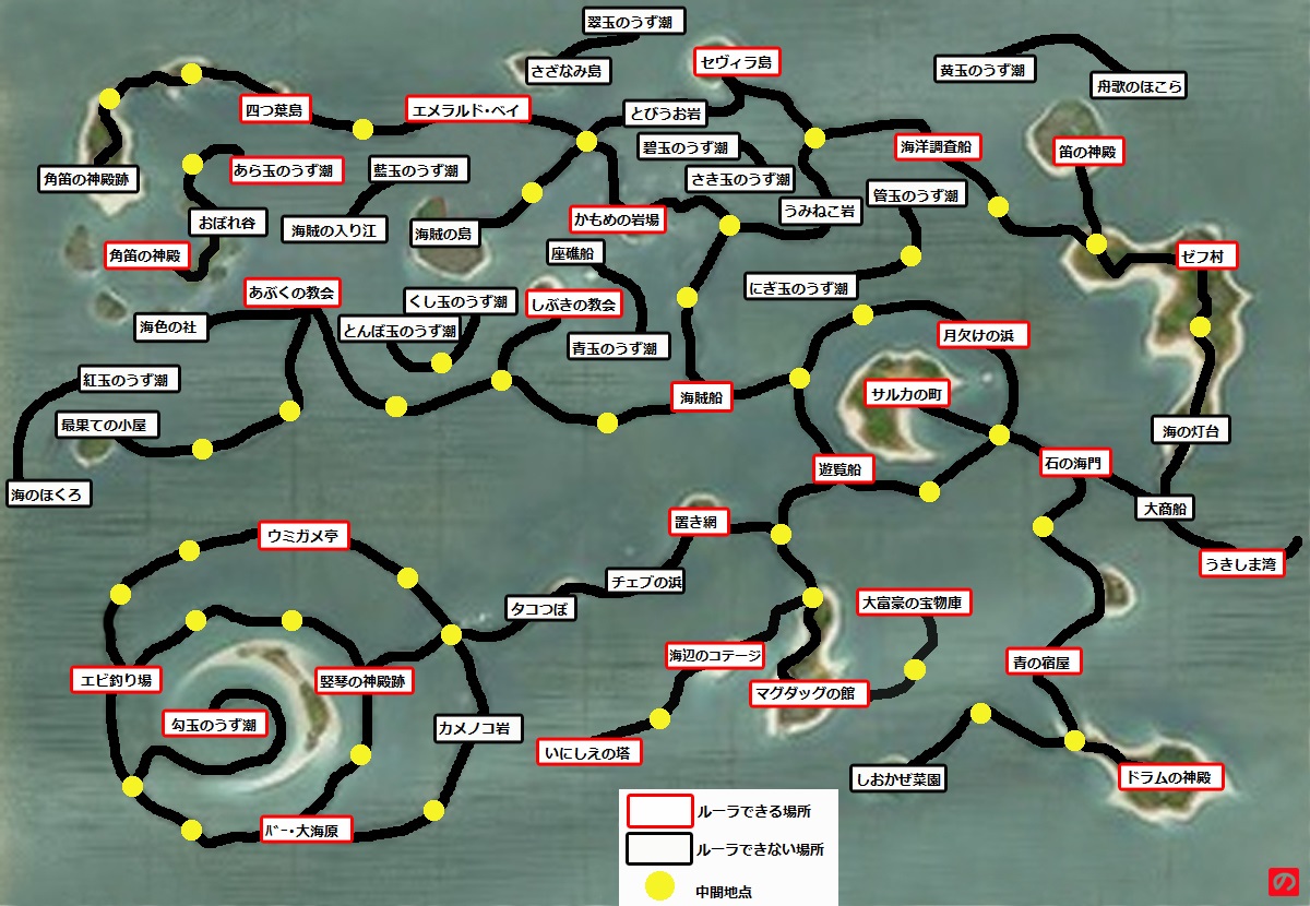 《緑の大陸》 《荒れ地の大陸》 《中央の大陸》 《炎の大陸》 《炎の大陸 近海》 《海神の領海》 《海の底》 《夜の大陸》 《光の大陸》 《いにしえの魂の座》 《闇はらむ雲海》 《石の世界》 《炎の世界》 《ミノロ島》 《魔獣の空域》 《魔獣の世界》 《地下世界》 ストーリーチャート※【 】・・・ルーラ可能 【うきしま湾】→大商船→海の灯台→中間→【ゼフ村】 【ゼフ村】→中間→【笛の神殿】 笛の神殿■笛の神殿 神殿入口→中間地点→中間地点→2階への階段(上に行く) 『1階への階段』→中間地点→中間地点→3階への階段(上に行く) 『2階への階段』→中間地点→守護者の間 宝箱 笛の神殿クリア後ルーラで【カルィム城】に戻る。 →緑の大陸へ。 海賊を追う【うきしま湾】→大商船→【石の海門】→中間→中間→【遊覧船】→中間→【海賊船】 【海賊船】→中間→中間→【かもめの岩場】→中間→中間→海賊の島 →緑の大陸へ。 潮だまり到達後【うきしま湾】→大商船 ルーラで【カルィム城】に戻る。(へんせいのタイミング無く戦闘になるので注意) →炎の大陸へ。 ユリヌス戦勝利後ルーラで【石の海門】に行く。 【石の海門】→中間→【青の宿屋】→中間→【ドラムの神殿】 ドラムの神殿■ドラムの神殿 神殿入口→中間地点→中間地点→中間地点→2階への階段(上に行く) 『1階への階段』→中間地点→中間地点→キザミの回廊→3階への階段(上に行く) 『2階への階段』→中間地点→守護者の間 ドラムの神殿クリア後ルーラで【遊覧船】に行く。 【遊覧船】→中間→中間→【マグダッグの館】 →荒れ地の大陸へ。 巨獣の巣クリア後ルーラで【マグダッグの館】に行く。 ルーラで【ザパタの町】に行く。 →炎の大陸へ。 海辺の墓場到達後ルーラで【マグダッグの館】に行く。 ルーラで【カルィム城】に行く。 →炎の大陸へ。 シピオ島後ルーラで【遊覧船】に行く。 【遊覧船】→中間→【置き網】→チェブの浜→タコつぼ→中間→【竪琴の神殿跡】 上下どちらのルートでもスタミナは同じだが、バー・大海原の方が酒場があるのでオススメ。 新マップ海の底に行く。 聖なる竪琴入手後ルーラで【かもめの岩場】に行く。 【かもめの岩場】→中間→【エメラルド・ベイ】→中間→【四つ葉島】→中間→中間→角笛の神殿跡 →海の底へ。 にぎ玉のうず潮後ここからは、領海と海の底の2つのマップを往復しながら進む。 管玉のうず潮→【海の底の町】→中間→【船の墓場】→さき玉のうず潮(領海へ) さき玉のうず潮→碧玉のうず潮(海の底へ) 碧玉のうず潮→【ホラ貝のほこら】→くし玉のうず潮(領海へ) くし玉のうず潮→中間→とんぼ玉のうず潮(海の底へ) とんぼ玉のうず潮→中間→あら玉のうず潮(領海へ) 【あら玉のうず潮】→中間→おぼれ谷→【角笛の神殿】 角笛の神殿■角笛の神殿 1階には3分岐がある。分岐先のワープは左→右に向かって、上→中、中→下、下→上、とつながっている。「下」ルートを選ぶと2階への階段までスタミナ6だが、通り道で宝箱2つ(まもりのたね、ランクの紋章E)が取れる。後で来るとスタミナ4使わないと宝箱2つを回収できない。宝箱が欲しいなら「下」がオススメ。 宝箱に全く興味がないなら、「上」「中」ルートを選ぶと2階への階段までスタミナ5で行ける。以下、宝箱回収ルート。 『1階への階段』→中間地点→転移の回廊①→転移の回廊②→転移の間(ワープする)→3階への階段(上に行く) ※転移の回廊①→白き羊の間( 宝箱 :普通の車輪(黒)) 転移の回廊②→黒き羊の間( 宝箱 :銀のふくびき券) 『2階への階段』→転移の間(ワープする)→転移の回廊③→転移の回廊④→4階への階段(上に行く) ※転移の回廊③→牧童の間( 宝箱 :ふしぎなきのみx1) 転移の回廊④→牧羊犬の間( 宝箱 :普通の荷台(黒)) 『3階への階段』→転移の間(ワープする)→中間地点→転移の回廊⑤(ワープする)→5階への階段(上に行く) ※転移の間→牧人の間( 宝箱 :おうぎのしょ) 転移の回廊⑤→牧場主の間( 宝箱 :普通のほろ(黒)) 『4階への階段』→中間地点→守護者の間 ※中間地点→白き牧神の間( 宝箱 :ランクの紋章D) 中間地点→黒き牧神の間( 宝箱 :いのちのきのみx2) ルーラで【カルィム城】に行く。 →炎の大陸へ。 闇の王の影戦(5回目)後ルーラで【マグダッグの館】に行く。 ※この段階で炎の大陸のカルィム大神殿2階中間分岐から隠しルートに行けるようになる。 →光の大陸へ。 刻印のほこらクリア後ルーラで【マグダッグの館】に行く。 いにしえの塔■いにしえの塔 輝ける門→中間地点→中間地点→うつろいの間(ワープする)→中間地点→2階への階段(上に行く) 『1階への階段』→中間地点→うつろいの回廊(ワープしない)→中間地点→3階への階段(上に行く) 『2階への階段』→うつろいの回廊(ワープする)→中間地点→うつろいの間(ワープする)→4階への階段(上に行く) 『3階への階段』→中間地点→うつろいの間(ワープする)→中間地点→5階への階段(上に行く) 『4階への階段』→黄昏の門 イベント後、い