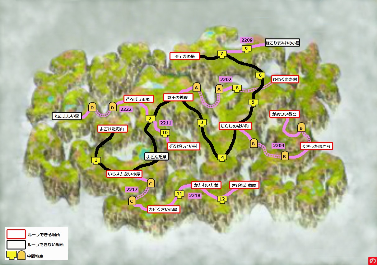 《緑の大陸》 《荒れ地の大陸》 《中央の大陸》 《炎の大陸》 《炎の大陸 近海》 《海神の領海》 《海の底》 《夜の大陸》 《光の大陸》 《いにしえの魂の座》 《闇はらむ雲海》 《石の世界》 《炎の世界》 《ミノロ島》 《魔獣の空域》 《魔獣の世界》 《地下世界》 《空中庭園》 ストーリーチャート※【 】・・・ルーラ可能 【よごれた泥山】→中間→【いじきたない小屋】 よどんだ泉では回復可能。 獣王の神殿■獣王の神殿 獣王の神殿入口→あやつりの間 獣王の神殿入口→彫像の間→2階への階段(上に行く) スイッチで片方の彫像が下がるともう片方は上がる。 『2階への階段』→中間地点→あやつりの間(スイッチを押す)→彫像の間・東→中間地点→4階への階段(上に行く) 左右どちらに進んでも玉座まではスタミナ5。以下は右ルート。 獣王の神殿クリア後【獣王の神殿】→中間→中間→【だらしのない町】→中間→中間→中間→【ジェガの塔】 ジェガの塔■ジェガの塔 左右どちらのあやつりの間に行ってもOK。 塔入口→彫像の間・南→あやつりの間→彫像の間・東→中間地点→2階への階段(上に行く) 『1階への階段』(左に進む)→中間地点→あやつりの間 彫像の間・東から左に行っても階段に行けるが、下に進んでスイッチを押せば宝の間への道が開く。 『2階への階段』(左に進む)→あやつりの間 『2階への階段』(上に進む)→彫像の間・南(右に進む)→あやつりの間→中間地点→彫像の間・北(上に進む)→4階への階段(上に行く) 左右どちらのルートでも行けるが、左は最初のあやつりの間でスイッチを「押す」、右は「押さない」選択が必要。以下は右ルート。 最初のあやつりの間でスイッチを押したら左、押さなかったら右に進む。以下は右ルート。 →ルーラで海の底へ。 マップ施設