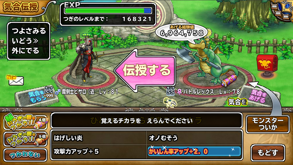 このイベントに旨みがあるかどうかの判断は十人十色になるが、超奥義はアタッカーや補佐役の技の伝承に使うべきだね。というのも、自分は会心20ちょいのシドー使いなんだが、会心は正直言ってあまりメリットがないよ。20を超えているのだがあまり会心を出してくれない。本当にたまにさ。たかが会心数%のアップ程度では何も変化はないし、会心なんかよりも攻撃力2999と超奥義を使った技の伝授がのほうが何よりも先決だとは思うがね。貴重な超奥義が勿体ないような気がする
