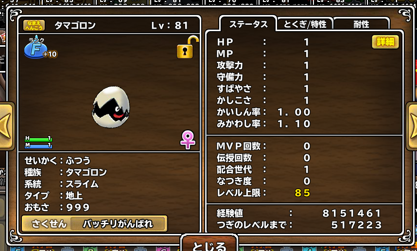 考察タマゴふくびき券で手に入る特殊なモンスター。 タマゴロン系同士以外どんなモンスターとも同種配合させることができ、転生モンスター、SSランクのモンスターなどにとって+値を上昇させる数少ない手段になる。 余談だがパレードには加えられないものの、移動姿や眠っているモーションはモンスター広場で確認できる。 2018年6月11日のアップデートより、同種配合される元のランクによってプラスされる量が変化するようになった。 ステータス(レベルアップ以外の能力値変動を除く)