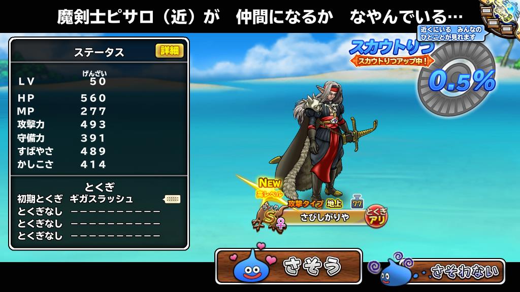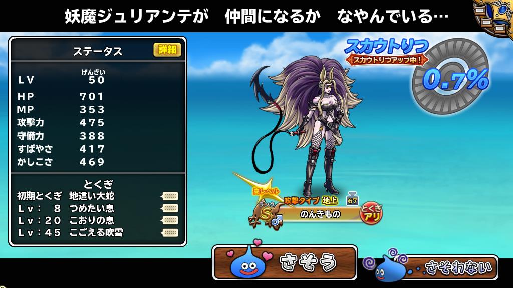 実際にスカチャン来たら興醒めしてしまった。なんでジュリアンテやのに「オス」やねん?! ムドーみたいなサンショウウオみたいなんだったら、オスでもメスでもいいけど。ドレアムにしてもピサロにしても、メスというのもオカシイ!! 見てくれと矛盾する場合はステータスにプラス・オカマボーナスをつけろ!! --