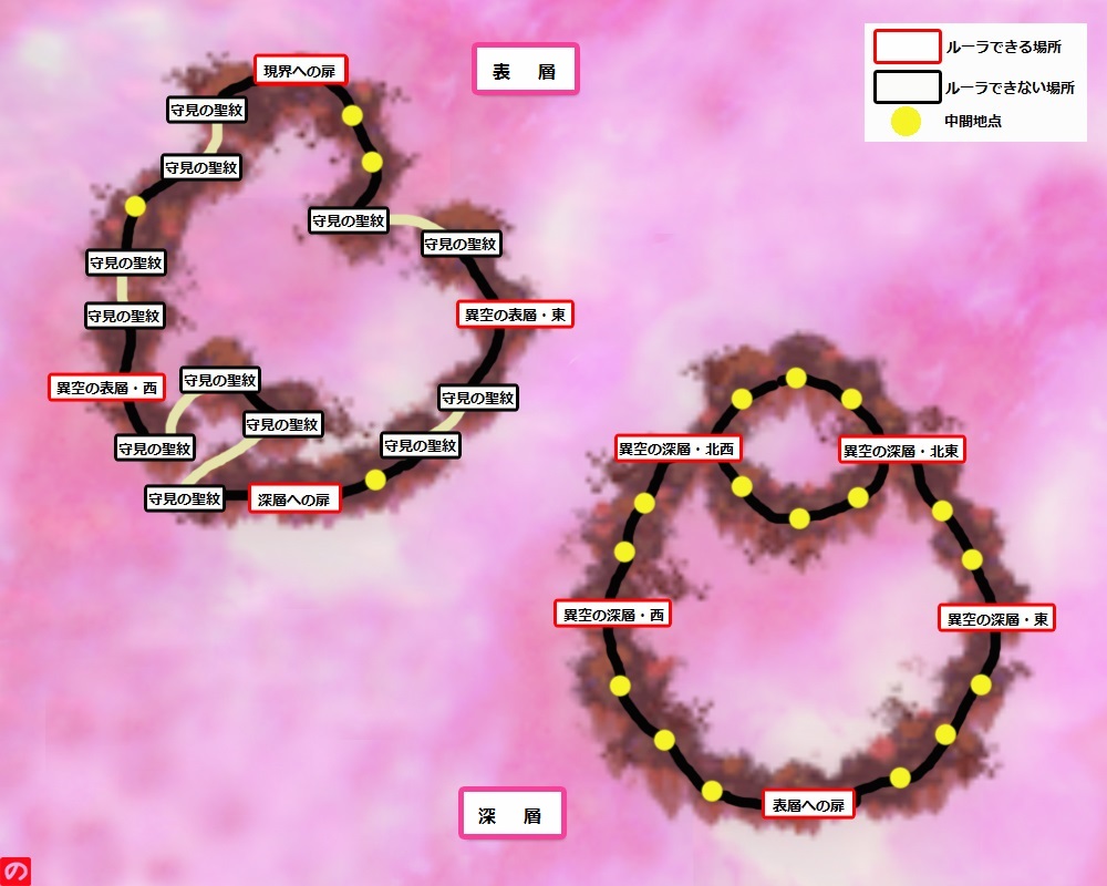 《緑の大陸》 《荒れ地の大陸》 《中央の大陸》 《炎の大陸》 《炎の大陸 近海》 《海神の領海》 《海の底》 《夜の大陸》 《光の大陸》 《いにしえの魂の座》 《闇はらむ雲海》 《石の世界》 《炎の世界》 《ミノロ島》 《魔獣の空域》 《魔獣の世界》 《地下世界》 《空中庭園》 《守見の異空》 《海の異空》 《ミノロ島の異空》 《荒れ地の異空》 ストーリーチャート※【 】・・・ルーラ可能 【現界への扉】→守見の聖紋(ワープする)→中間→守見の聖紋(ワープする)→【異空の表層・西】→守見の聖紋(ワープする)→守見の聖紋(ワープする)→深層への扉(すすむ) 深層ではスィージャを捕まえる必要がある。守見の異空の時と同じで、スィージャはこちらが2回動くごとに1歩動く。動きは固定(要検証)で最初の3回は右へ動くため、一見遠回りに見える右に進めば7パレ目で異空の深層・北東で捕まえることができる(要検証)。 捕まえると、スィージャLv99+フレイムLv80×2と戦闘。 マップ施設