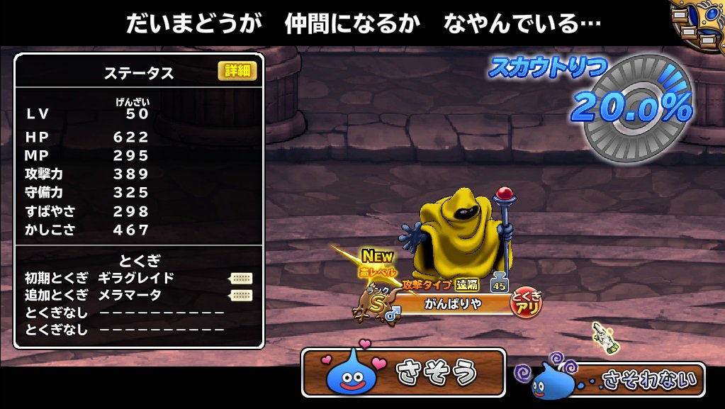 ふつうLv50一発ゲットしましたのでご報告。HP533、MP373、攻撃力374、守備力342、素早さ325、賢さ492、会心率3.00、みかわし率2.00。すべてギルドボーナスを除いた基礎値です。 --